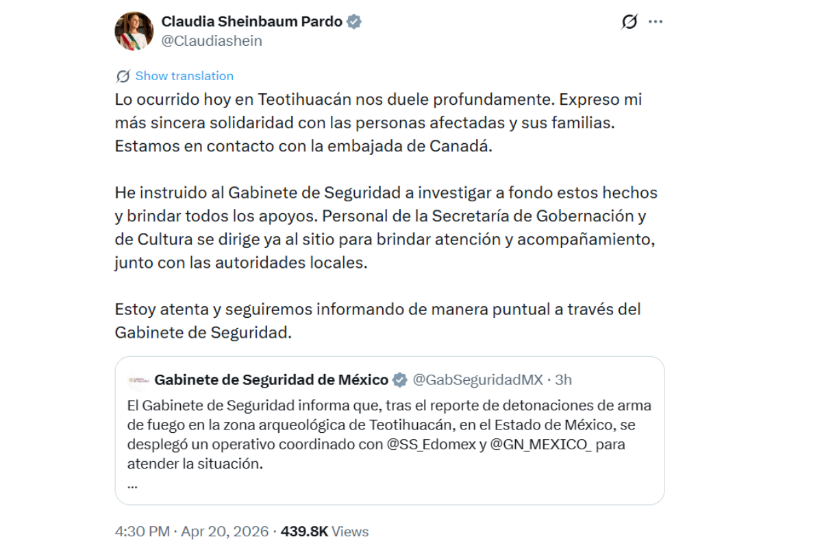 El ataque ocurrió este lunes 20 de abril en la Pirámide de la Luna, dentro del sitio arqueológico ubicado en el Estado de México. En un mensaje difundido en redes sociales, el Gabinete de Seguridad informó: "un hombre realizó disparos en el lugar y posteriormente se privó de la vida. Lamentablemente una mujer de nacionalidad canadiense perdió la vida".
