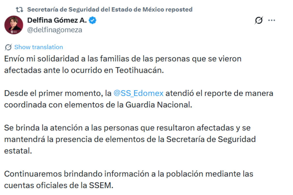 Por su parte, la gobernadora del Estado de México, Delfina Gómez, informó por X que las fuerzas estatales atendieron el reporte desde el primer momento en coordinación con la Guardia Nacional. En su mensaje escribió: "Envío mi solidaridad a las familias de las personas que se vieron afectadas ante lo ocurrido en Teotihuacán".