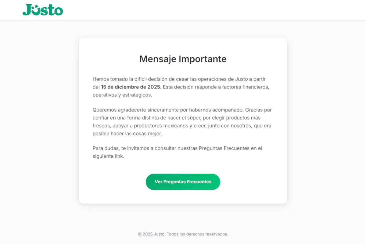 Jüsto, plataforma mexicana de supermercado digital fundada en 2019, dejó de operar en México el 15 de diciembre de 2025. De acuerdo con un comunicado oficial, la decisión se debió a una combinación de factores financieros, operativos y estratégicos. La empresa agradeció públicamente el apoyo recibido por parte de sus clientes durante el tiempo que estuvo activa.