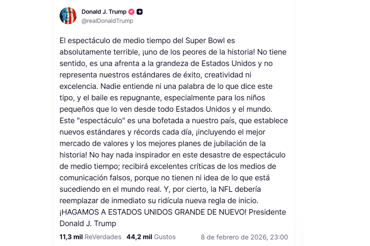 Como era de esperarse, la presentación generó reacciones encontradas. El presidente Donald Trump le dedicó una extensa publicación en Truth Social: "¡El espectáculo del medio tiempo del Super Bowl es absolutamente terrible, uno de los peores de la historia! Nadie entiende una palabra de lo que dice este tipo, y el baile es repugnante, especialmente para los niños pequeños que lo ven en todo Estados Unidos y en el resto del mundo". Además, calificó la actuación como una "afronta a la grandeza de América".